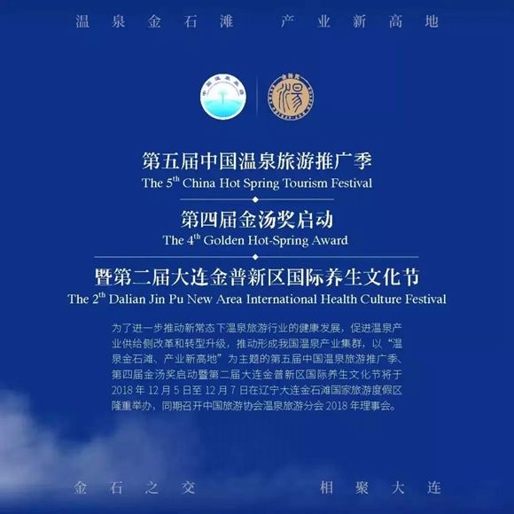 12月5日,第二屆金湯溫泉養生文化節將在金石灘啟幕,本屆溫泉節由中國旅游協會溫泉旅游分會和金普新區管委會主辦,金石灘國家旅游度假區管委會和金湯獎組委會承辦,魯能易湯海洋溫泉和唐風溫泉協辦。以“溫泉金石灘產業新高地”為主題,搭建溫泉旅游產業國際交流與合作平臺,推動溫泉旅游產業國際合作,促進大連形成溫泉康養產業集聚地,樹立“大連溫泉”的品牌,提升其知名度和美譽度。