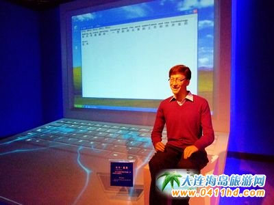 大連金石蠟像館三樓運用了大量的多媒體技術,令人應接不暇。首先進入科技之光,依次為愛迪生、牛頓、愛因斯坦、居里夫人、達爾文。這個展區的亮點是比爾蓋茨,這里運用了多媒體互動,在一個巨型的電腦上一雙大手在鍵盤上輕輕敲擊,屏幕上便出現了一行字,這是利用了投影技術。航天英雄楊利偉、聶海勝、費俊龍,后面的大屏幕是投影播放火箭升空的場面,轉過來有中國五位科學家,鄧稼先、錢學森、錢三強、李四光、袁隆平。這邊有一個噴水池,配上藍色的燈光和周圍蠟像搭配的非常完美。